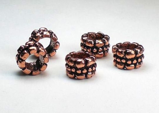 Genuine copper 10mm tube beads. These large hole beads have an interesting design that will look well with many styles and a 5.5mm hole, perfect for leather and other cording.