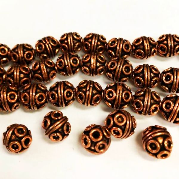 Bali style decorative round copper beads. Darkened in the recessed areas to show off the shiny copper design. These solid copper beads will be perfect for necklace and bracelet designs.