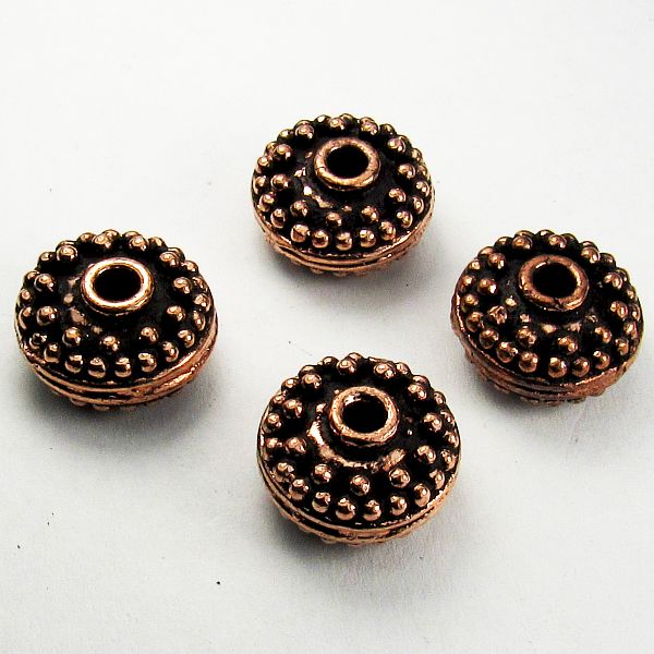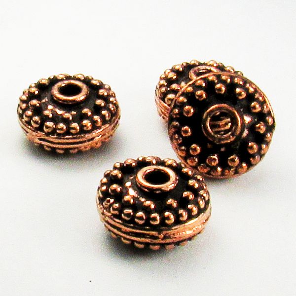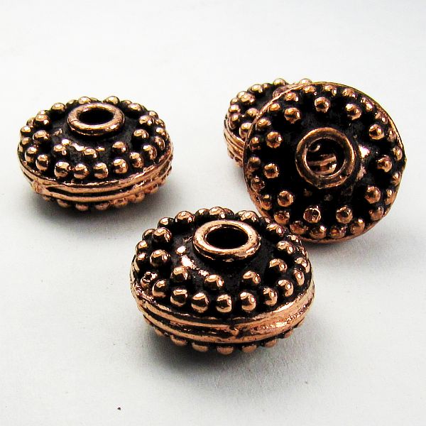 Large hole copper coin bead. This ornate bead is darkly oxidized in the recessed areas allowing the raised portions to shine. Very ornate and lovely, Bali style solid copper beads!