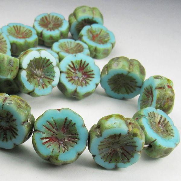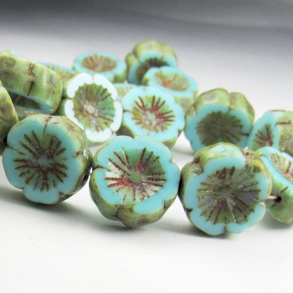 Carved hibiscus flower tea green turquoise Opaque Czech glass beads. This new tea green color is similar to turquoise, a bit brighter perhaps and gorgeous. The picasso finish beautifully emphasizes the design. Superb for all types of jewelry designs- earrings, necklaces and bracelets.