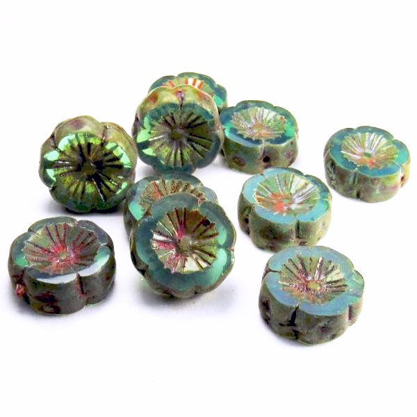 14mm Tea Green Turquoise Hibiscus Flower Bead, Picasso Czech Glass Beads 8 pcs. F-750