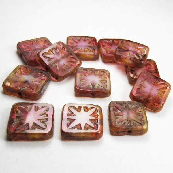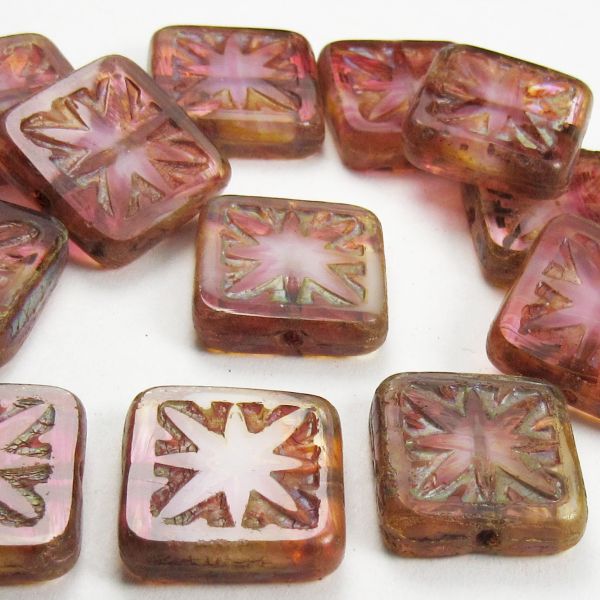 Pink carved square Czech glass beads with a compass pattern. These beads are a gorgeous combination of pink and amber. The light green picasso finish in the recesses accents the design. Each side has the identical carved pattern. Excellent for tribal or ethnic designs and perfect for earrings, necklaces or bracelets. I absolutely LOVE this bead!