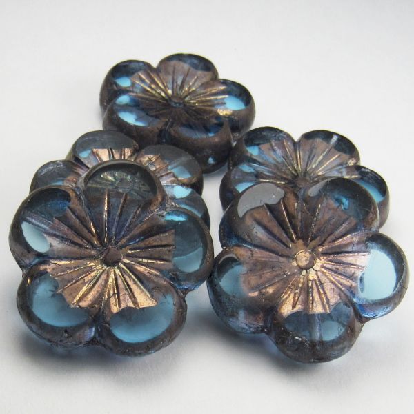 22mm Blue Hibiscus Flower Beads with Copper Picasso, Czech Glass Beads 2 pcs. F-1122
