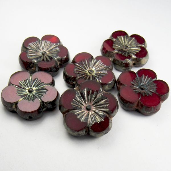 Carved 22mm ruby red Czech glass beads with a carved hibiscus flower center. The silvery picasso finish beautifully emphasizes the design. Superb for all types of jewelry designs- earrings, necklaces and bracelets. Prettier than my photo...