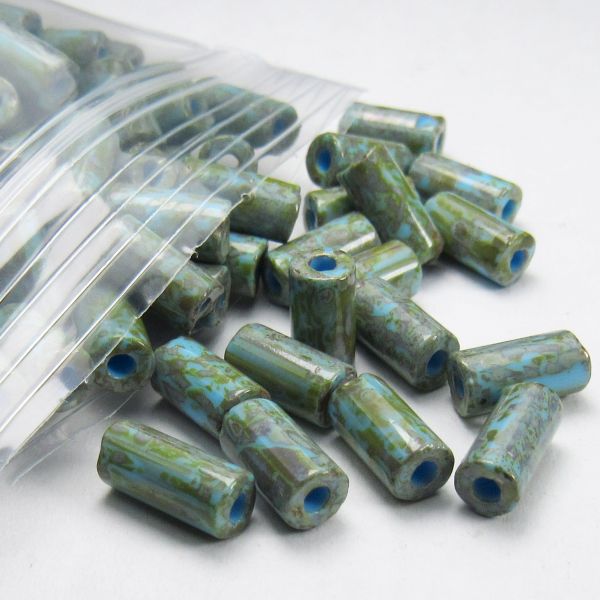 8mm Blue Czech Glass Tube Beads with a Green Picasso Finish 20 Grams T-86805-8