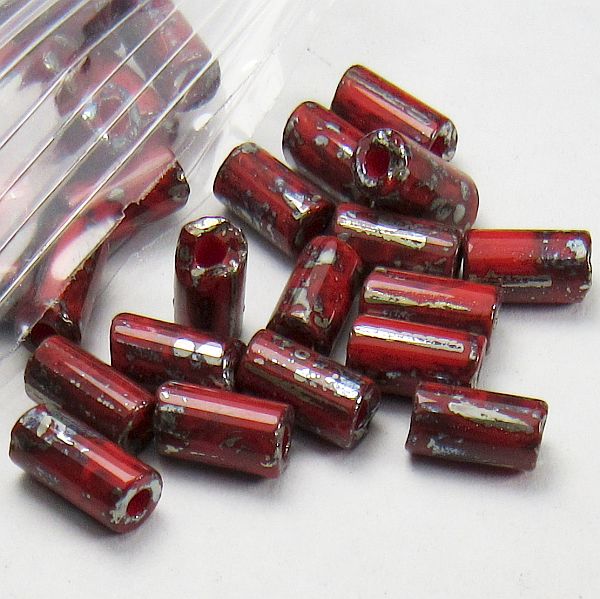 8mm Red Czech Glass Tube Beads with Silver Metallic Picasso Finish 20 Grams T-86806