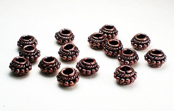 Decorative solid copper spacer beads.These beads have the central bump pattern surrounded by a twisted wire. Beautiful and useful spacer beads. Large hole bead- my 2mm leather easily fits through the bead hole. Genuine copper. Great shape, design and size.Just beautiful!