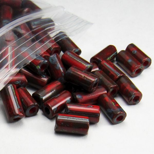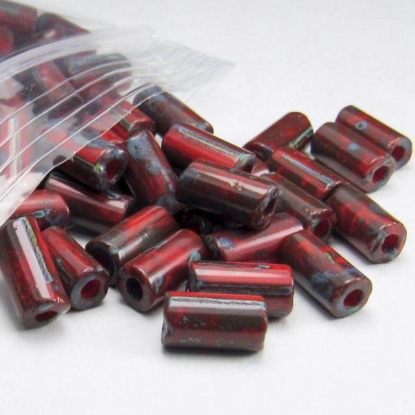 8mm Red Czech Glass Tube Beads with Blue Picasso Finish 20 Grams T-86800