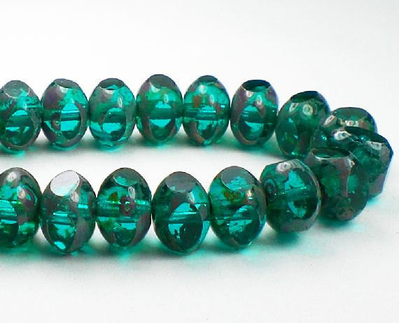Sea Green Czech glass rondelle quadries beads. These translucent quadries have 4 cut sides with a light picasso in other areas of the beads. They are an incredible color, almost emerald but a tad more blue. Just lovely!