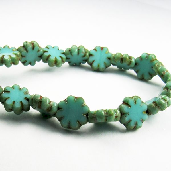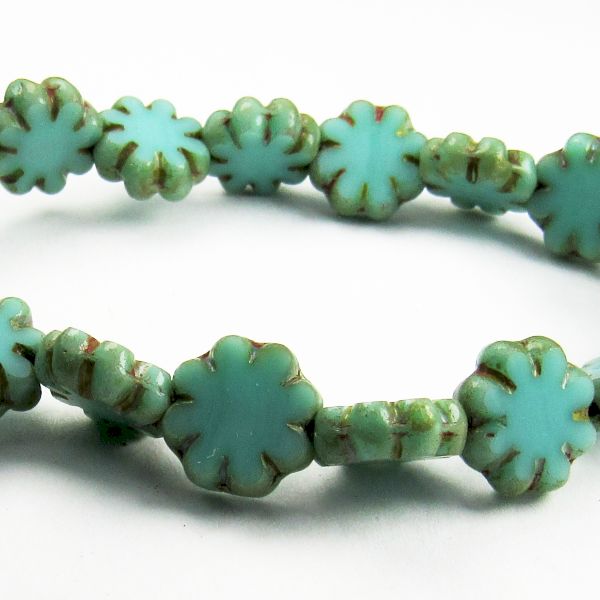 Sea green turquoise Czech glass flower beads with a picasso finish to accent the design. The sea green color is new and absolutely gorgeous! These beautiful little flower beads are excellent for earrings, bracelet and necklace designs!