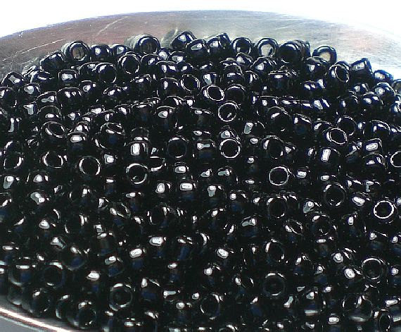Jet black Toho seed beads, perfect for bead weaving, spacers, bead work, etc. These 8/0 round rocailles Japanese seed beads are known for their high quality, uniform sizing and larger holes. Jet black opaque.