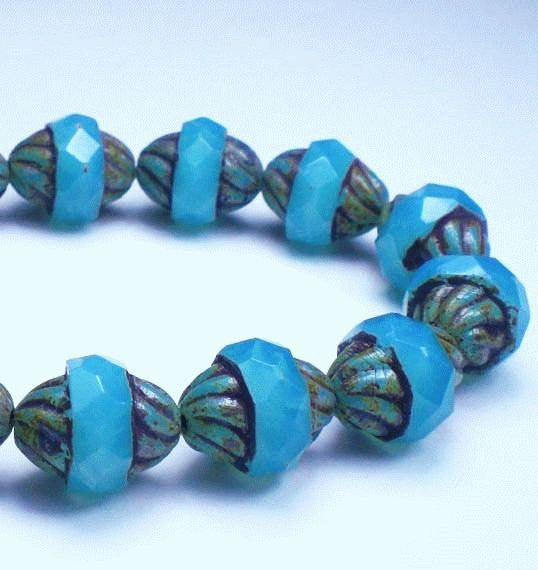 Beautiful opalite blue twisted turbine beads. These Czech glass twisted turbine beads consist of two rounded end pieces made up of twisted blue glass. These end pieces are accentuated with a warm reddish picasso finish. The middle section is a nice thick blues faceted band. Absolutely gorgeous!