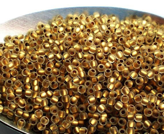 Crystal gold lined frosted 11/0 Toho seed beads, perfect for bead weaving, spacers, bead work, etc. These 11/0 round rocailles Japanese seed beads are known for their high quality, uniform sizing and larger holes.