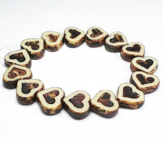 Ivory carved heart beads with a brown picasso finish in the recessed areas. These beads very much resemble wood. The opaque hearts are rustic and perfect for earrings, necklace and bracelet designs. Czech glass beads.
