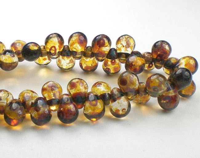 Clear Czech glass drop beads in With an amber picasso finish. Amber beads are extremely popular for good reason. At 9mm these are wonderful for earrings, necklaces and bracelet designs.