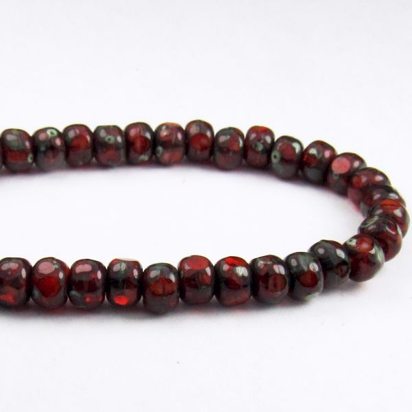 Translucent deep red splashed randomly with a picasso finish. I'm in love with these new Czech glass trica (3 cut) beads, each has 3 cuts or windows. These are perfect whether used in mass or as a spacer bead. Each a little masterpiece.