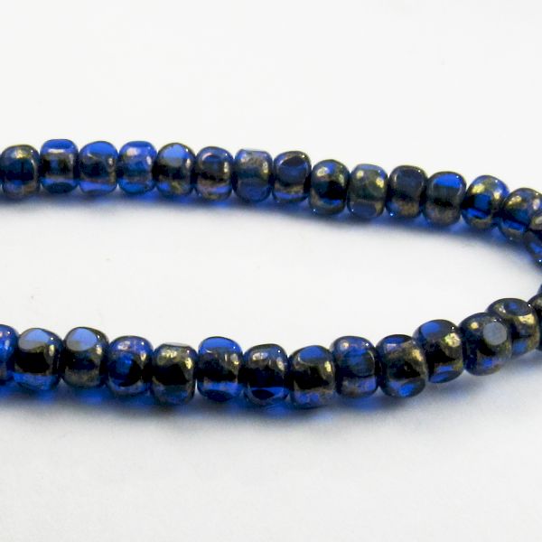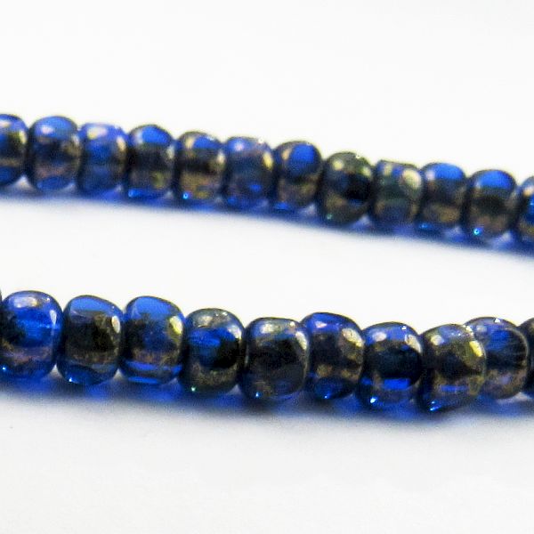 Translucent cobalt blue or sapphire with a picasso finish. I'm in love with these new trica (3 cut) beads. There are three cut flattened areas per bead. These are perfect whether used in mass or as a spacer bead. Each a little masterpiece. The manufacturer calls the color sapphire, I call it cobalt. In any case it is beautiful!