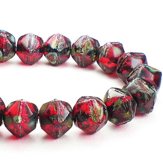 Translucent red with a green and blue picasso finish English Cut Czech glass beads that look so fantastic. This new shape is superb and comes in so many really great colors and both 10 and 8mm.