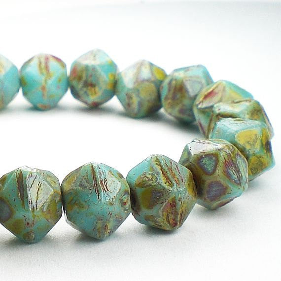 Wonderful sky blue w/a red and green picasso finish English Cut Czech glass beads. This new shape is superb and comes in so many really great colors and both 10 and 8mm.