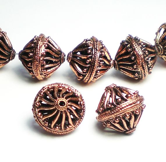 Genuine copper bicone beads. These exquisite filigree beads are finely detailed and truly a work of art. The size and shape are also wonderful for necklace and earring designs.