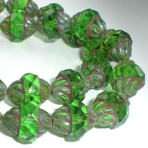 Gorgeous peridot green large twisted turbine beads. These fire polished beads consist of two rounded end pieces made up of twisted transparent glass. These end pieces are accentuated with a contrasting reddish brown picasso finish. The middle section is a nice thick faceted green band. Excellent for necklace, earring and bracelet designs!