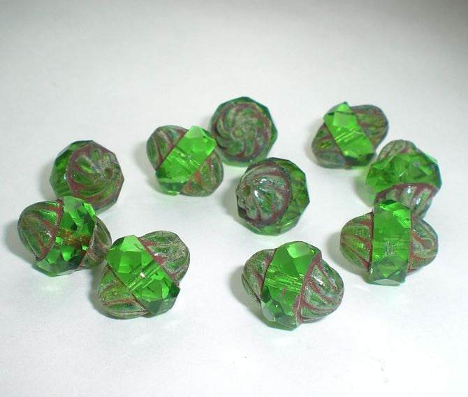 Faceted Peridot Green Turbine Bead, Fire Polished Picasso Czech Glass Beads, Green Bicone Beads 11x10mm 10 pc T-049