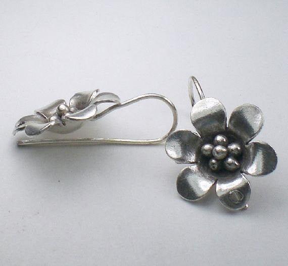 Fine silver 18mm flower on sterling silver ear wires are stunning. The flowers sport a 1.7mm hole on the bottom of the petal to add your dangle from (or not). I am working on 2 designs with these, one with thin chain and one with leaves. Made by the Karen Hill Tribe silversmiths at my request as a one time design so not possible to restock. Just beautiful, nicer than my photos!
