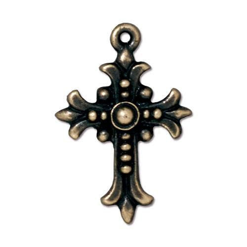 TierraCast's highly decorative Fleur Cross charm. This beautiful cross is large enough to wear as a pendant as well. Chose either an antiqued fine silver, Antiqued copper or brass oxide finish in the drop down at the top of the listing.