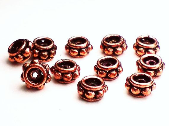 Handmade solid copper spacer beads in a larger 6mm size. These beads are fantastic spacer beads and this size is hard to find. A central circle of balls capped by rings, oxidized in the nooks and shiny on the raised surfaces. This is NOT a large hole bead. There is an inner central piece with a hole in the center. Please see photo.