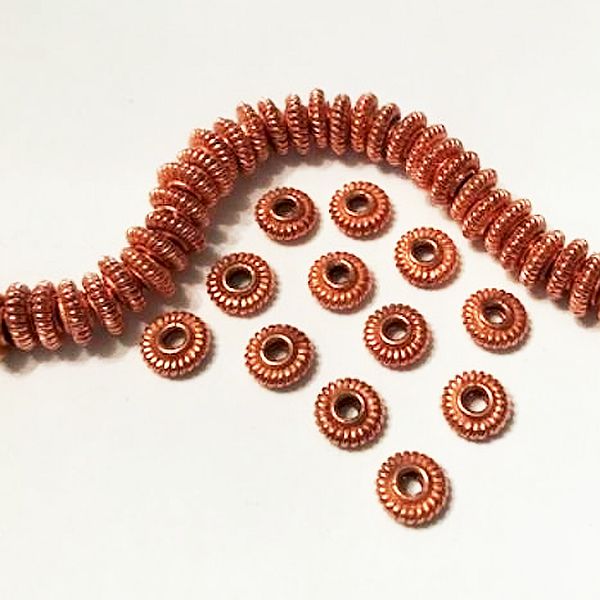 Wonderful genuine copper rondelle coil beads of bright copper. Surrounding the coil on each side is a ring. These bright and beautifully made beads have a 3.5mm hole that will accommodate up to 3mm leather or other similarly sized string material, if desired! These solid copper beads will naturally oxidize over time or you can patina with eggs or a chemical such as liver of sulphur.