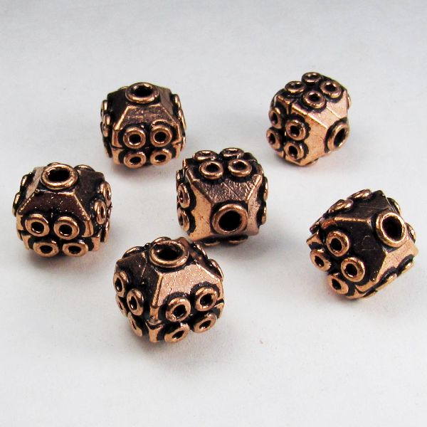 Genuine copper large hole beads. These beads are lightly oxidized around the ethnic designs leaving the rest of the copper bright. Your 2mm leather (or other stringing material) will easily fit. Beautifully shape and design!