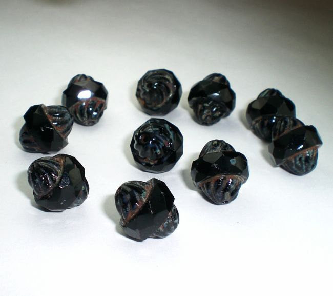 Jet Black Twisted Turbine Bead Picasso Czech Glass Beads 11x10mm Faceted 10 pcs. T-057