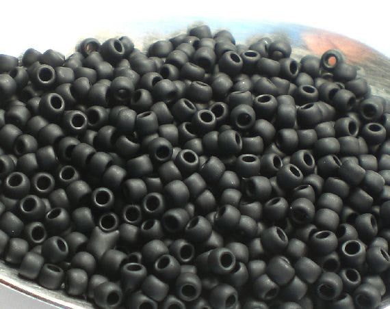 Jet black frosted Toho seed beads, perfect for bead weaving, spacers, bead work, etc. These 8/0 round rocailles Japanese seed beads are known for their high quality, uniform sizing and larger holes. Matt black opaque.