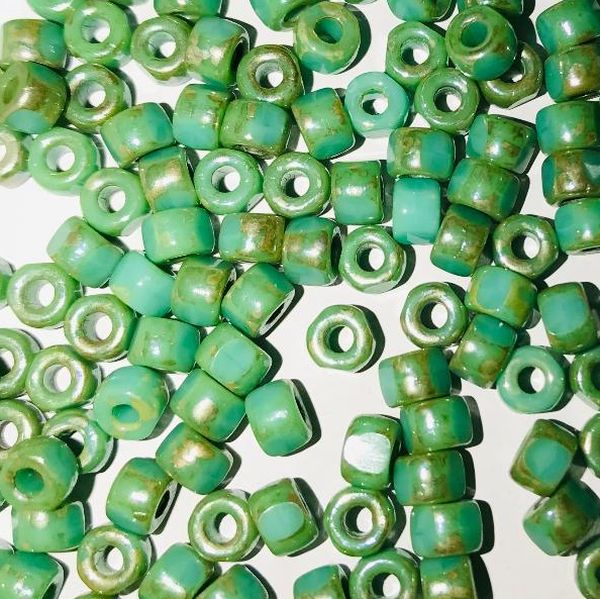 Gorgeous green turquoise beads with a silvery picasso finish, my favorite turquoise color! 6//0 3 Matubo Czech glass beads. Some of the beads are 3 cut, some not, a wonderful combination! Your 1mm leather or stringing will fit this bead.