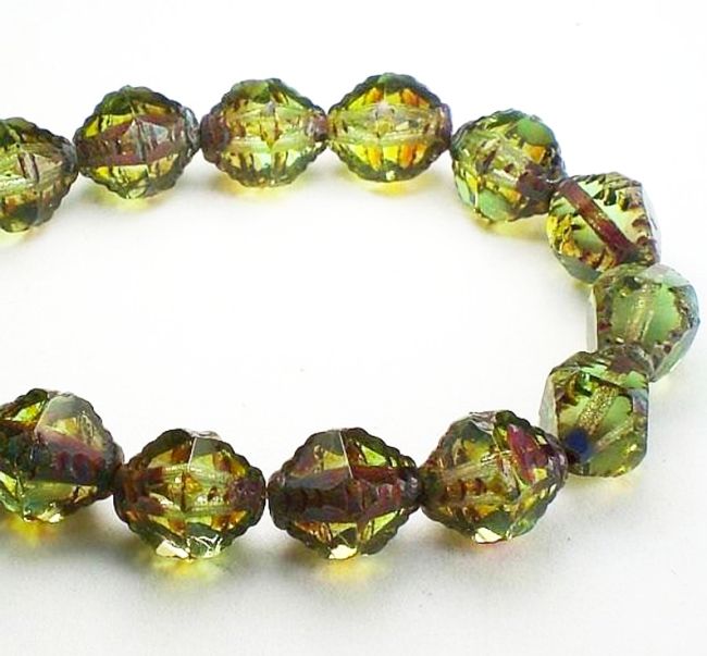 Picasso Czech Glass Beads 10mm Carved Bicone Olivine Green Bead 10 Pcs. B-443