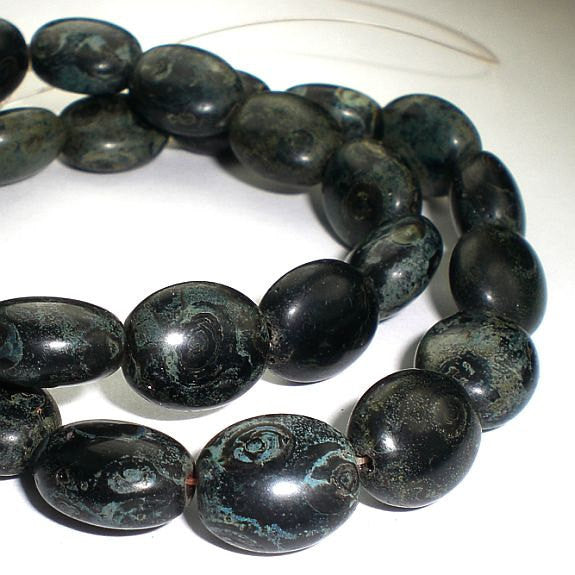 Matt black oval beads with a blue and green picasso finish make these beads appear stone like, actually each could be a unique underwater scene as well. Drilled top to bottom and perfect for any of your rustic designs.