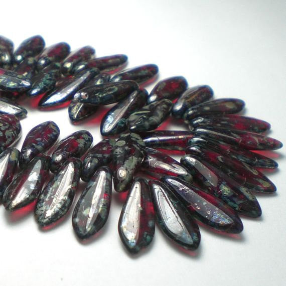 Rubyt red dagger beads with a green and blue finish. These gorgeous shiny translucent beads constantly surprise with their varying colors as each bead is unique and wonderful. I've seen some incredible necklaces made with these and some beautiful earrings. Offered as a set of 50...because you will want that many to start!