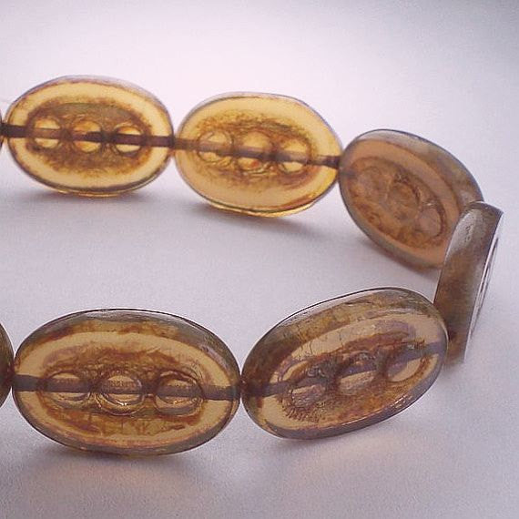 A very pale pink opalite base with amber picasso on an oval dot bead. These translucent Czech glass beads have an organic carved pattern. The picasso finish emphasizes the design. Wonderful for all types of jewelry designs. Rustic and inspiring!