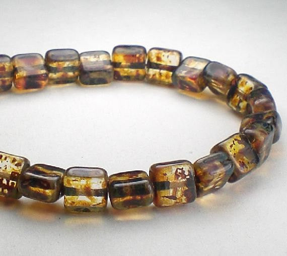 Square chiclet Czech glass amber beads with an all over brown picasso dribbled throughout. The translucent beads are rustic and outdoorsy. Wonderful for all types of jewelry designs.