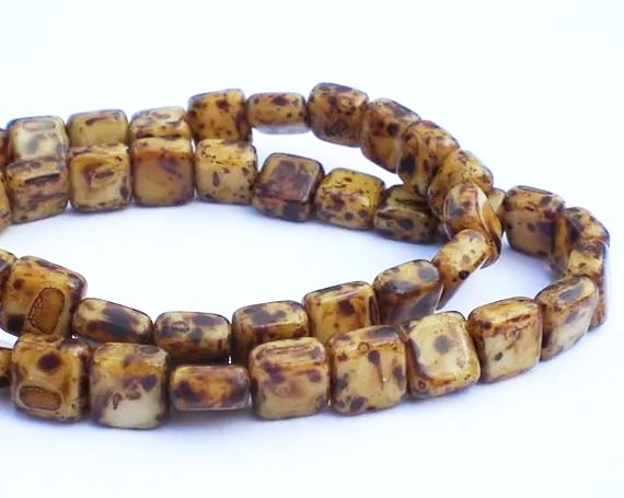Square chicklet Czech glass beads with an all over pattern resembling burled wood.. The tan beads have a brown picasso finish. Wonderful for all types of jewelry designs. Rustic and inspiring!