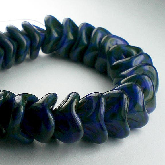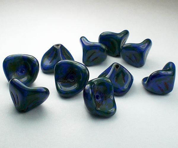 Blue and greenl large three petal flower bead. These Czech glass flowers are the large 12mm size and each of the 3 petals has two lines carved for detail. Just lovely. Your imagination is your only limit!