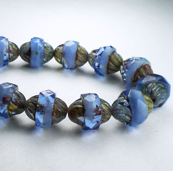 Gorgeous opaque and translucent light sapphire blue twisted turbine beads. These faceted turbine beads consist of two rounded bicone end pieces made up of twisted blue glass. These end pieces are accentuated with a traditional warm red brown picasso finish. The middle section is a nice thick faceted band. Gorgeous!!!