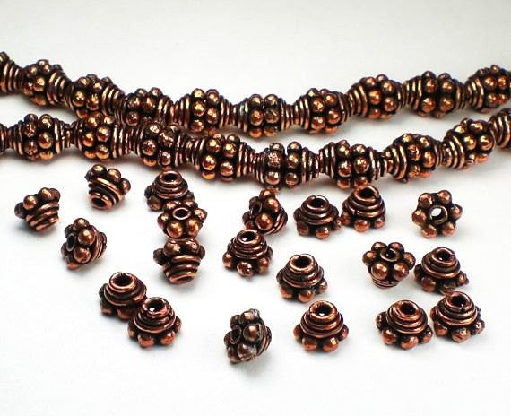 Genuine copper asymmetrical beads. These unique Bali style beads are oxidized in the recessed portions. I like to use these at the ends of beads or in between all lined in the same direction.They can also be put together to form one large bead. You can let them darken naturally or oxidize through chemicals or heat if desired.