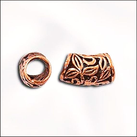 Genuine copper large hole beads. These curved tube Bali style beads have a pretty leaf and flower design and are able to accommodate scarves, leather, heavier chains, up to 5.5mm wide. You can let them darken naturally or oxidize through chemicals or heat if desired.
