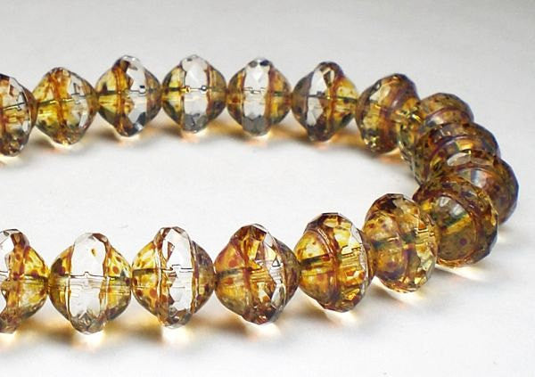 Beautiful new UFO or space ship beads! These Czech glass picasso beads are faceted in the center, the clear faceted central color is surrounded by amber picasso on the round ends. This is a very popular color combination because it is really gorgeous and goes with so many other colors.