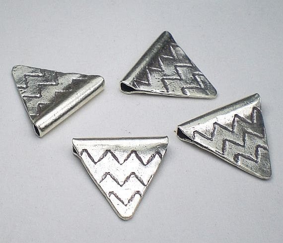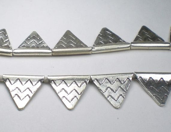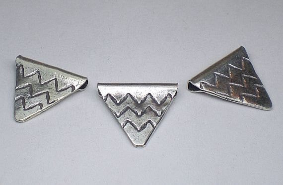 Tribal ethnic triangular beads stamped with a chevron pattern. Made of fine silver by the Karen Hill Tribe silversmiths in Thailand. Perfectly sized and the bottom edge is gently rounded so as not to be sharp. Perfect for bracelet and necklace designs I can also think of good earring usage. The 2mm hole accommodates wire or beading wire, not leather.