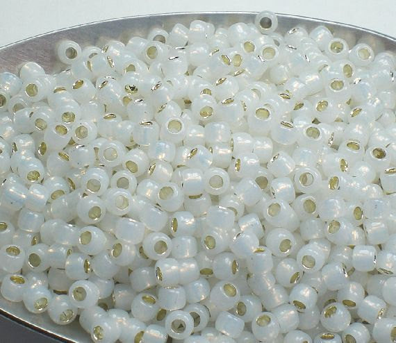 Milky white silver lined Toho seed beads, perfect for bead weaving, spacers, bead work, etc. These 8/0 round rocailles Japanese seed beads are known for their high quality, uniform sizing and larger holes.